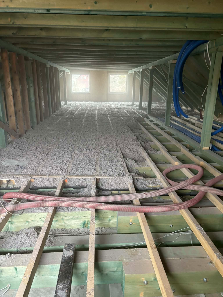 Látszik az egyik munkánkon, hogy a befújásra váró tér ~35 cm vastag. Ezt a hagyományos hőszigetelő módszerrel nehézkes lett volna elvégezni. Viszont a celluló szigetelő módszerrel könnyedén, gyorsan és ami még fontosabb: szinte BONTÁS NÉLKÜL sikerült megcsinálni.